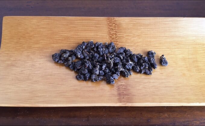 黒っぽくて(焙煎?)丸まった茶葉です。
