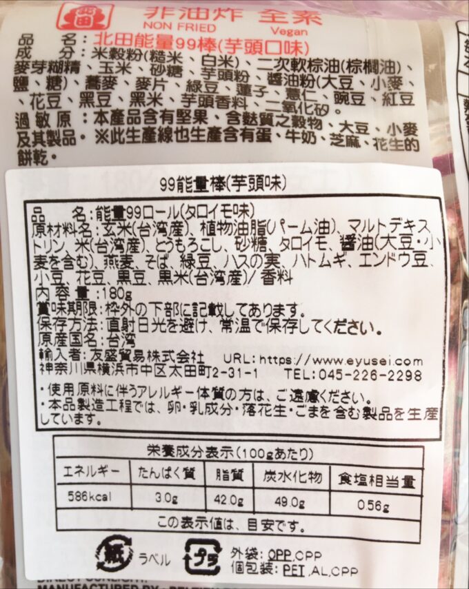 レシートには「ノンフライ玄米ロール」と書かれていたのですが、商品名は「北田能量99棒」のようです。”エナジー99バー”って感じでしょうか。